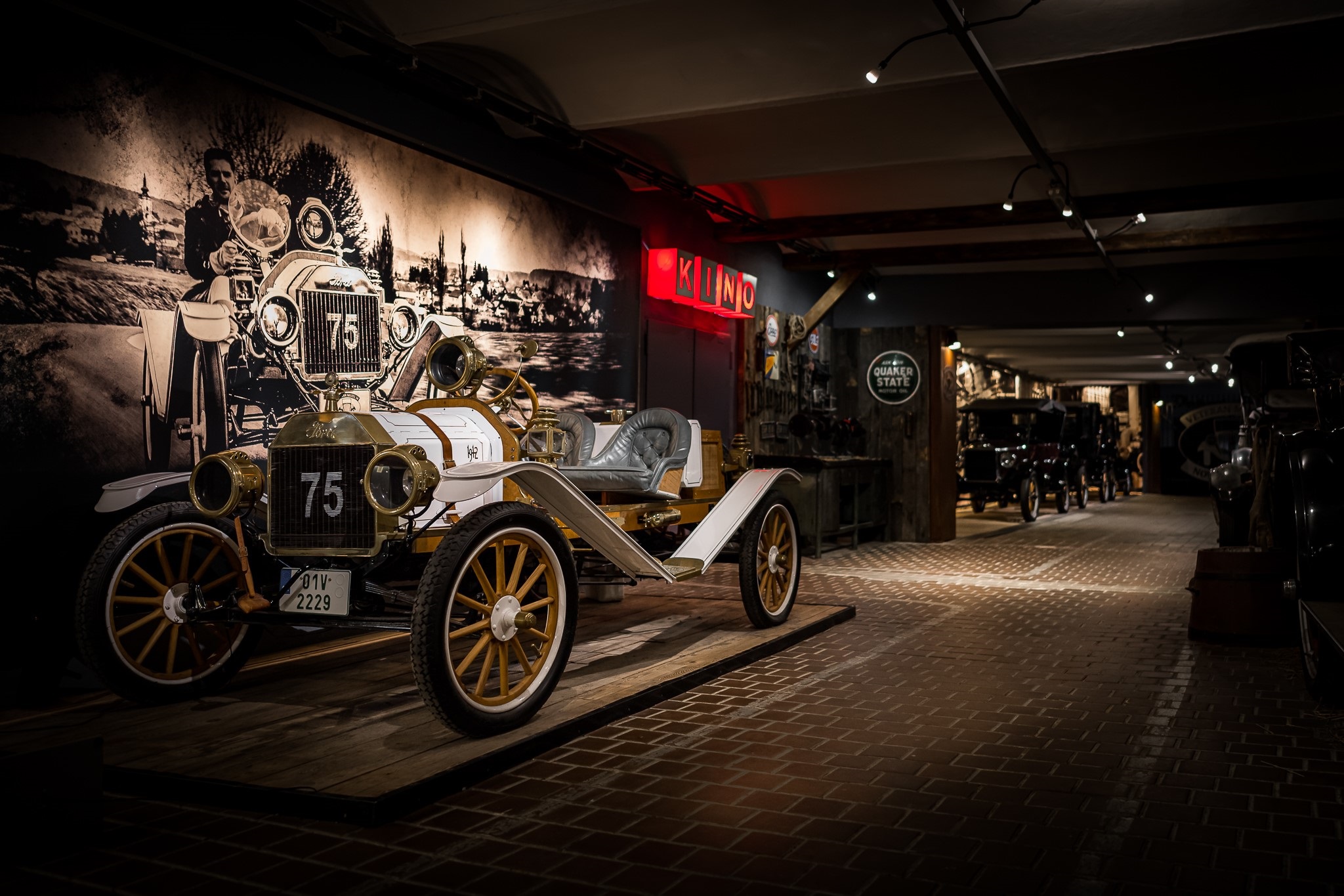 Vstupujete do sálu, který je nejstarší částí továrny, ze které je nyní naše muzeum. Vlastně se jedná o chodbu. V ní se kdysi tlačily po vyznačených tratích vozíky s dekami. Ano, s dekami a ty tratě na zemi ještě najdete. Továrna totiž byla textilní. Po vzoru nejstarší části fabriky zde najdete i to nejstarší, co u nás máme. Rozhodli jsme se, že úvodní část muzea zasvětíme tak zvané mosazné éře, tedy automobilům první a druhé dekády minulého stolení.